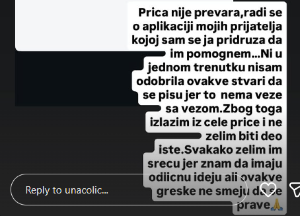– Приказната не е измама, станува збор за апликацијата на моите пријатели на која се приклучив за да им помогнам. Во ниту еден момент не одобрив да се пишуваат такви работи, бидејќи тоа нема никаква врска – напиша Уна, додека во претходно споменатите пораки беше наведено дека секој што ќе се согласи да ја промовира апликацијата ќе добие реклама на инстаграм-профилот на Уна.