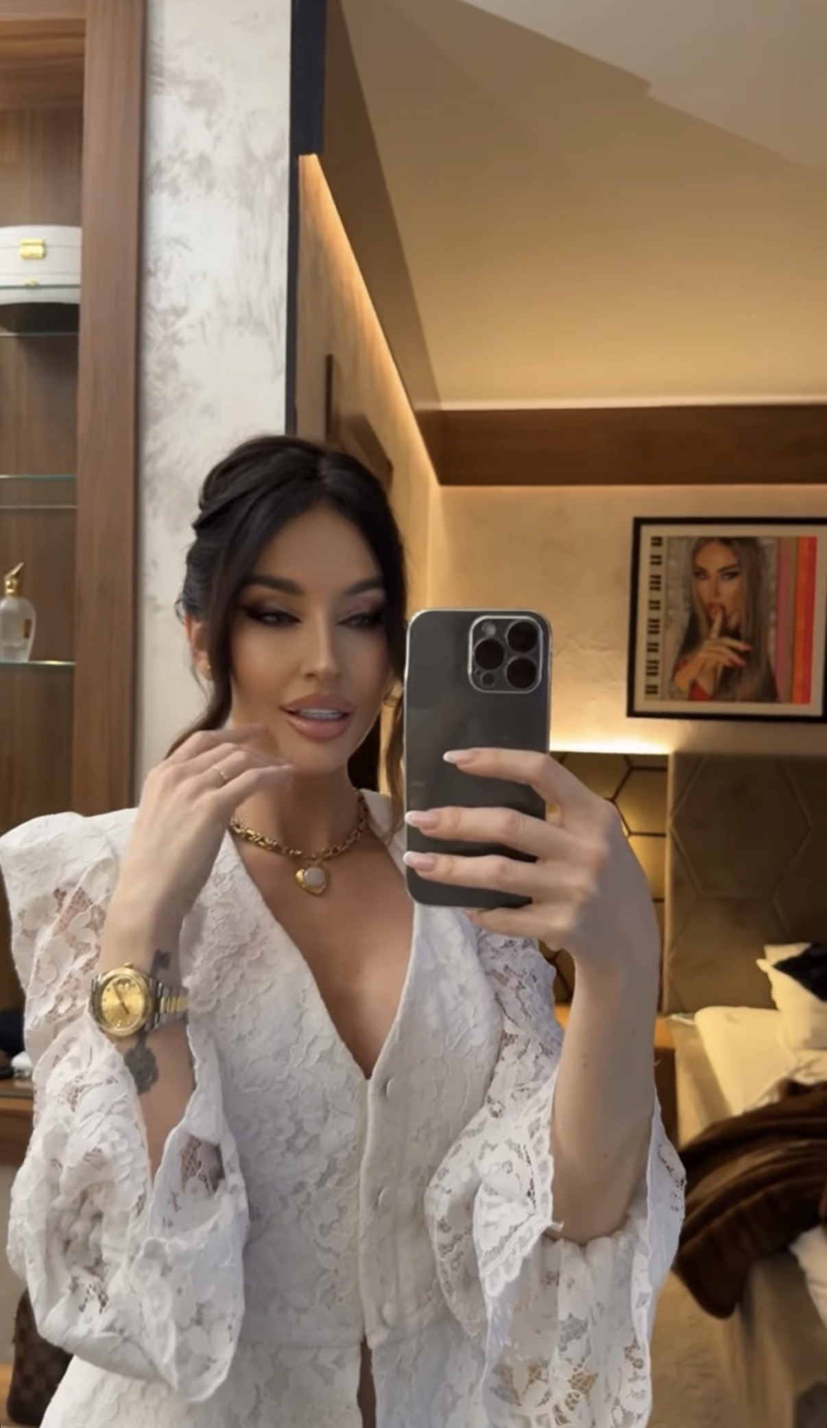 Каќа позираше пред огледалото во бел чипкаст фустан, а зад неа имаше луксузен и раскошен плакар, кој се наоѓа во спалната соба.