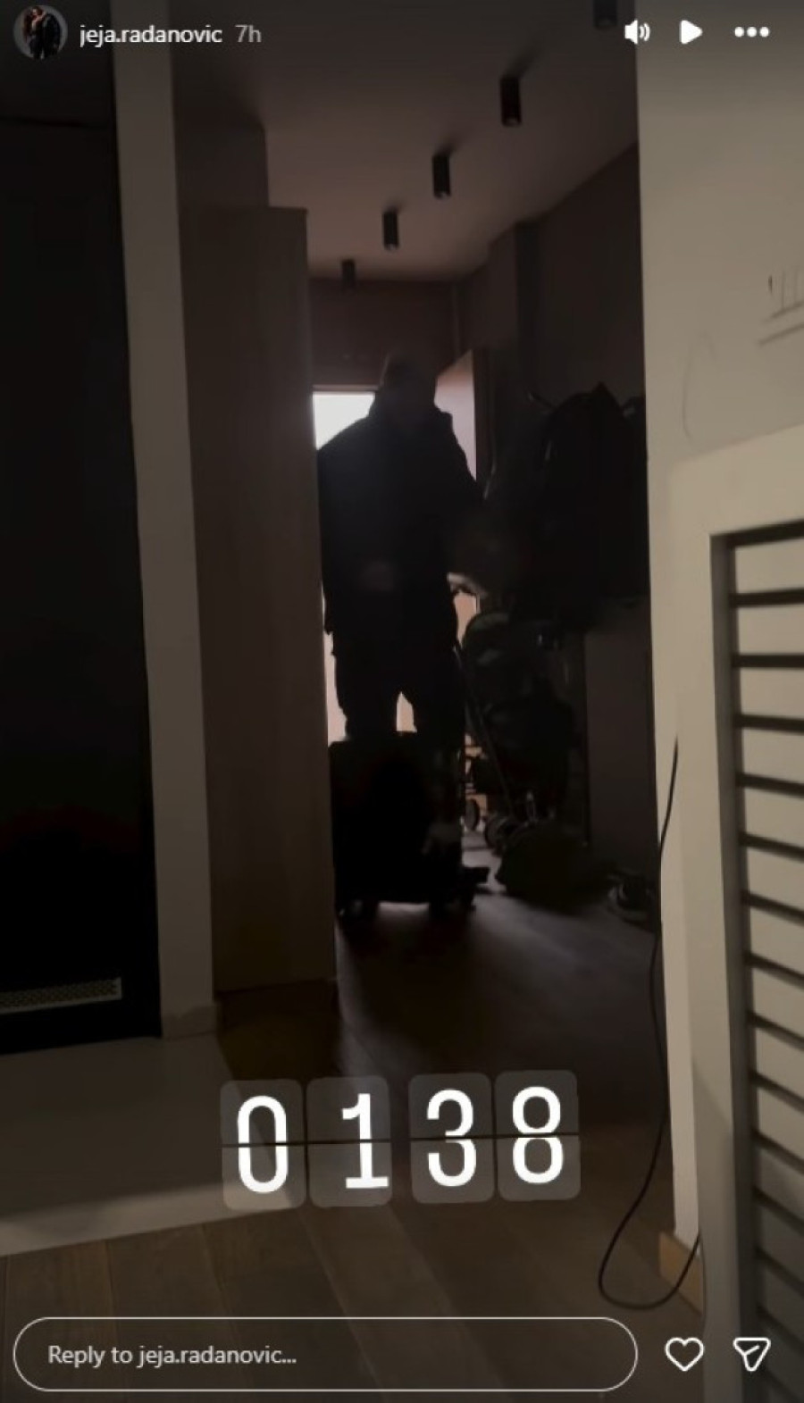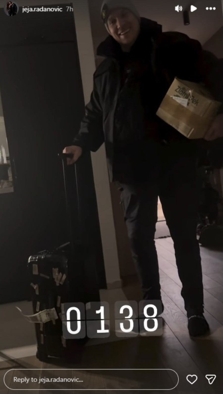 Неговата сопруга, Јелена Радановиќ, објави видео од моментот кога Слоба го преминува домашниот праг — со куфер и картонска кутија во раце. Влегол во станот во 1:30 по полноќ, каде што го дочекала семејството.