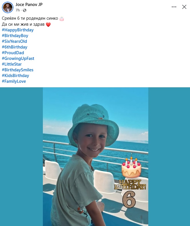 Имено, синчето на Јоце слави роденден, а гордиот татко со фотографија од синчето напиша: „Среќен 6-ти роденден синко. Да си ми жив и здрав“.