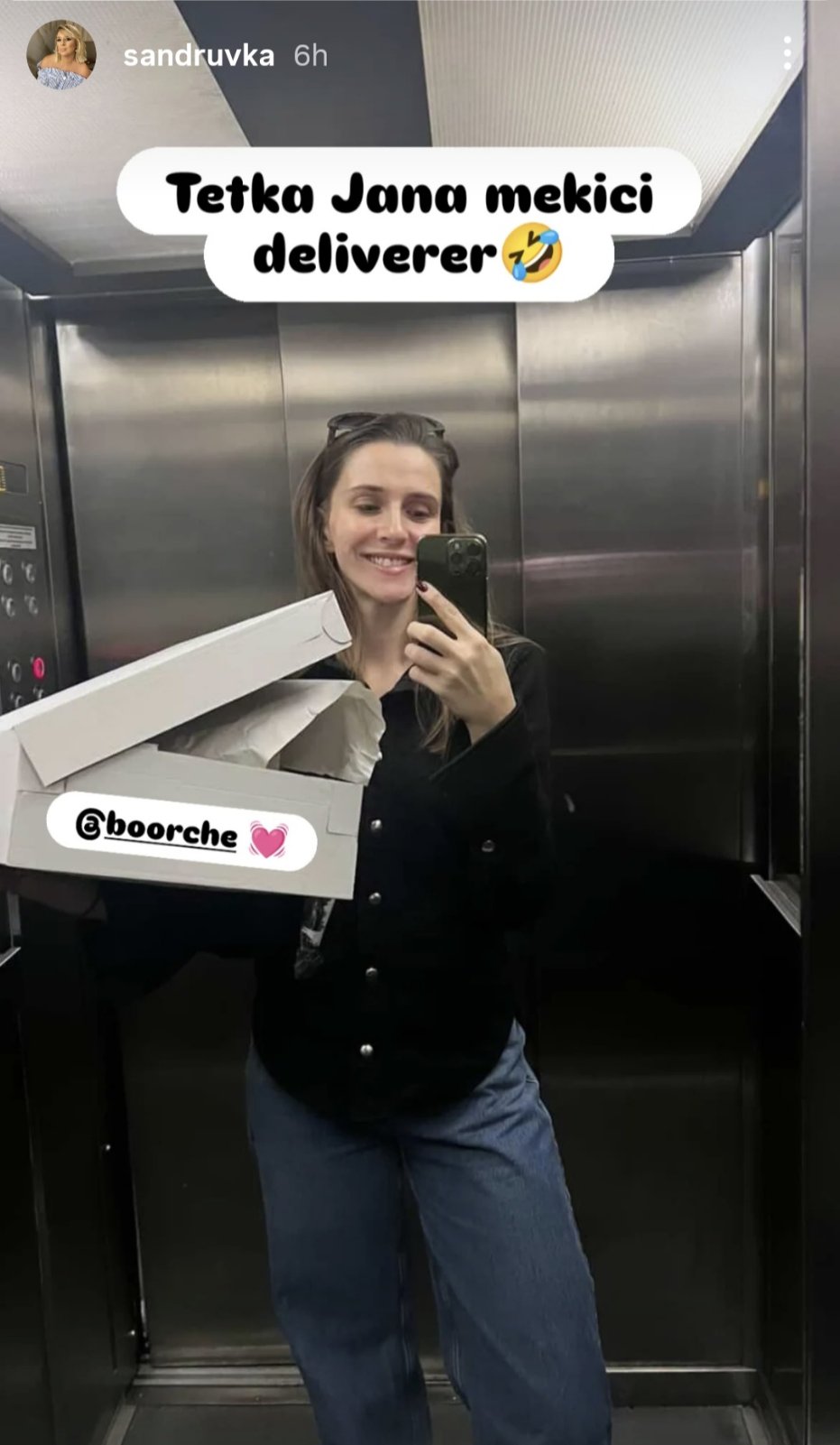 Станува збор за пејачката и водителка Јана Бурческа, која работи заедно со Александра. Среќната мајка објавила фотографија од Јана како носи мекици за новороденчето и напишала: „Тетка Јана, доставувач на мекици“.