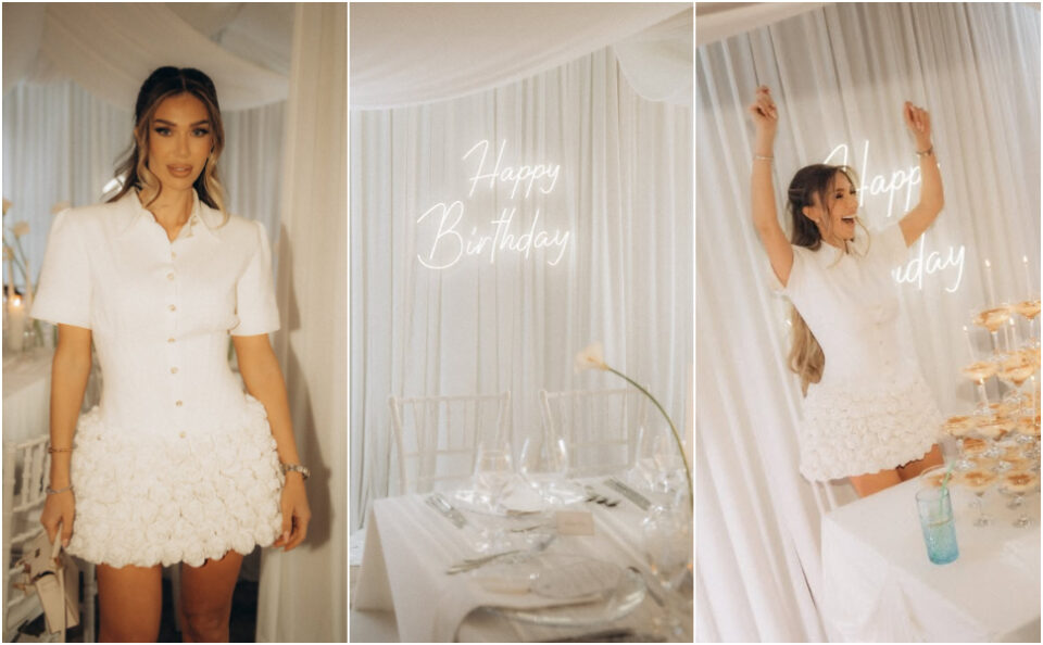 Славеничката се појави во мини бел фустан со цветни апликации, а откри дека меѓу подароците добила и чанта од брендот Hermès.