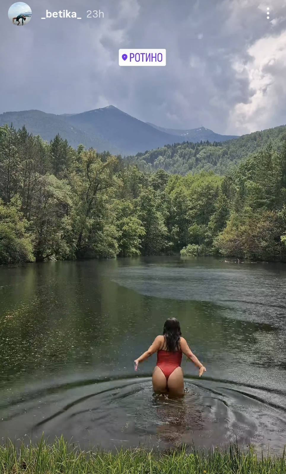 Таа објави инстаграм-приказна како влегува во езерото на дожд, облечена во танга костим за капење кој ги истакнува нејзините облини.