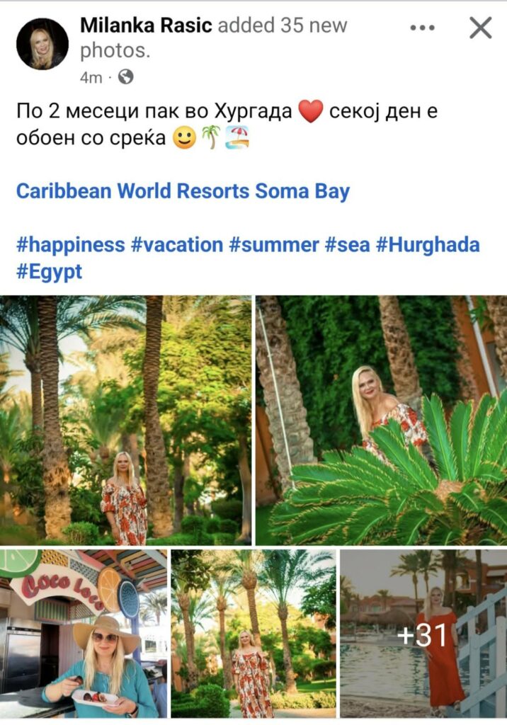Миланка објави интересни егозитчни слки од неа на плажа, и кусо напиша: „По 2 месеци пак во Хургада. Секој ден е обоен со среќа“.