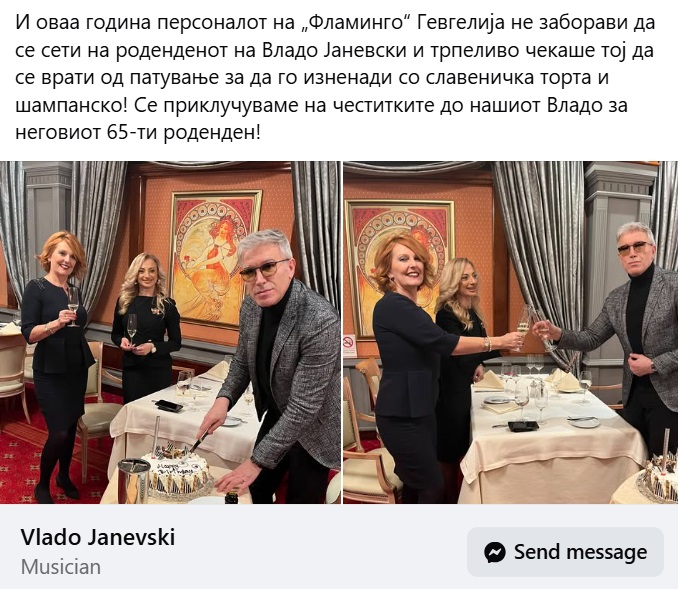 Пејачот и автор инаку наполни 65 години, а изгледа доста помладо и се одржува во добра форма. Од роенденската забава во едне познат хотел во Гевгелија беа објавени слики на неговиот официјален Фејсбук профил.