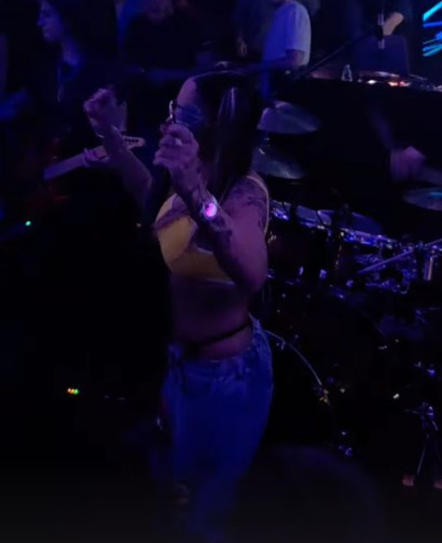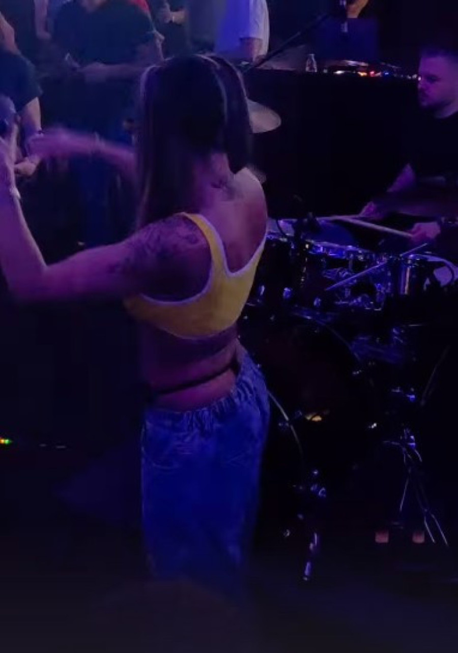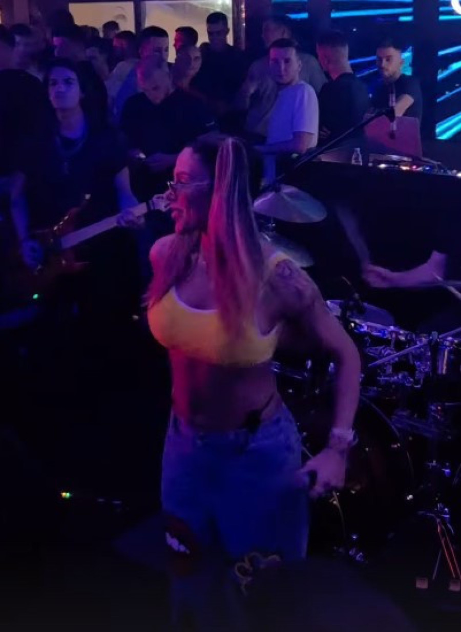На сцената се појави во краток жолт топ и широки фармерки – едноставна, но внимателно одбрана комбинација, целосно прилагодена за настап. Облеката јасно ја истакнуваше нејзината фигура и ѝ даваше модерен, сценски изглед.
