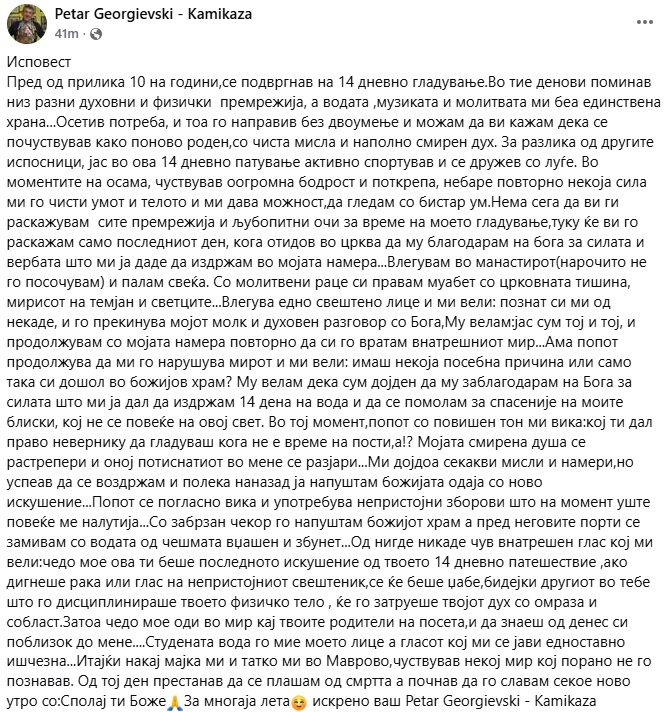 Цели четиринаесет дена гладувал, а во тој период му се случило нешто кое многу го вознемирило. Музичарот Петар Георгиевски-Камиказа од групата „Меморија“ целосно си ја отвори душата.