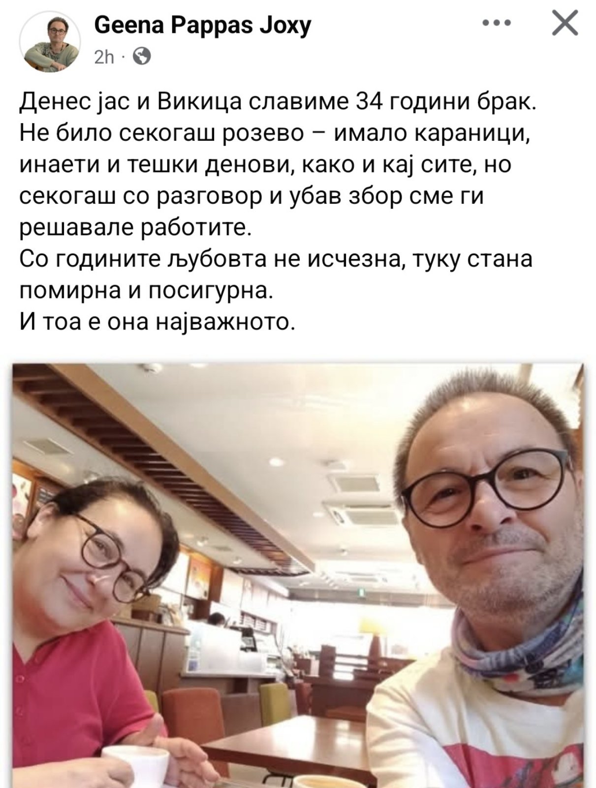 – Денес јас и Викица славиме 34 години брак. Не било секогаш розово – имало караници, инаети и тешки денови, како и кај сите, но секогаш со разговор и убав збор сме ги решавале работите. Со годините љубовта не исчезна, туку стана помирна и посигурна. И тоа е она најважното – напиша Џокси кој е долги години на македонската естрада, а остана најпознат по хитот „На Велигден“.