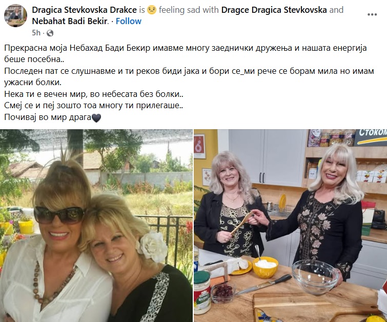 „Прекрасна моја Небахад Бади Бекир имавме многу заеднички дружења и нашата енергија беше посебна.. Последен пат се слушнавме и ти реков биди јака и бори се. Ми рече, се борам мила но имам ужасни болки.