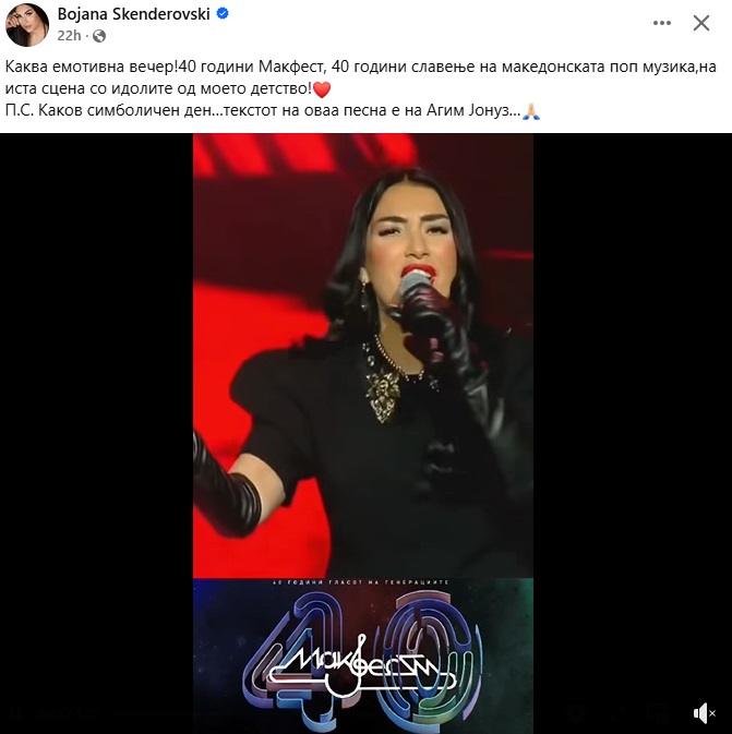 А токму истиот ден, Бојана Скендеровски пееше на „Макфест“ негова песна, и со многу емоции, таа на Фејсбук објави: