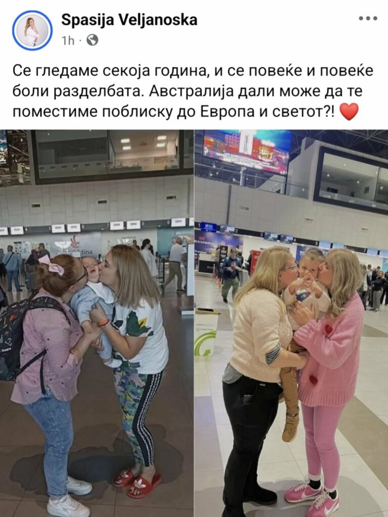 Таа на Фејсбук се отвори за животот во Австралија и за тоа колку ѝ е тешко да се раздели од нејзиното семејство кога доаѓа во Македонија.