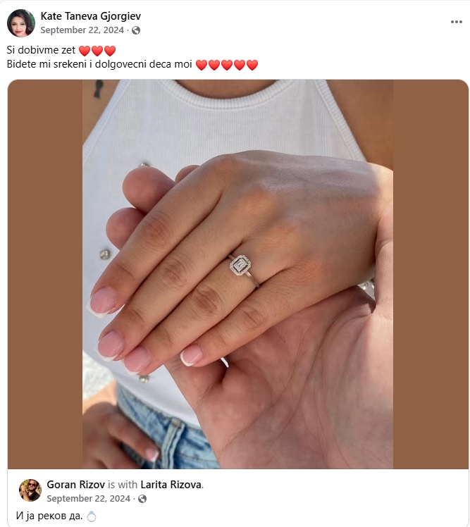 Во септември во 2024 година, Кате на Фејсбук објави дека добила зет, а на сликата ги означи нејзината ќерка Ларита и зетот Горан. Инаку, пејачката од Неготино не го експонира приватниот живот во јавноста.