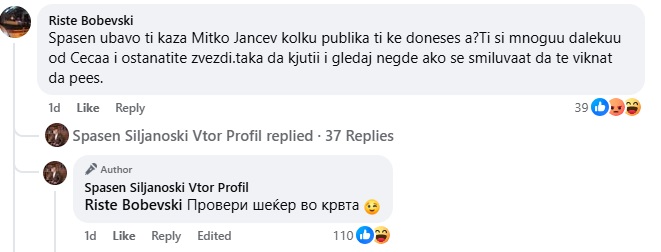 Потоа, во друг коментар на Спасен му велат: „Спасен, убаво ти кажа Митко Јанчев. Колку публика ти ќе донесеш а? Ти си многуу далекуу од Цеца и останатите ѕвезди. Така да ќути и гледај негде ако се смилуваат да те викнат да пееш“, а пејачот и на ова одговори: Провери шеќер во крвта“.