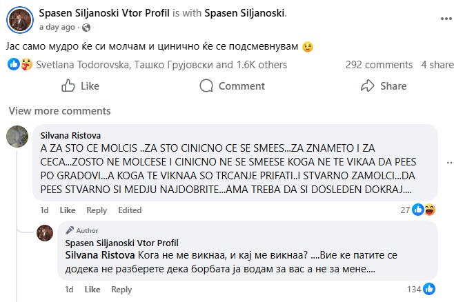 -Јас само мудро ќе си молчам и цинично ќе се подсмевнувам“, напиша Спасен на Фејсбук по повод оваа случка, а потоа доби ваков коментар: