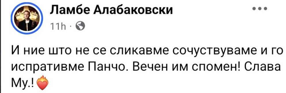 „И ние што не се сликавме сочувствуваме и го испративме Панчо. Вечен им спомен! Слава Му!“.