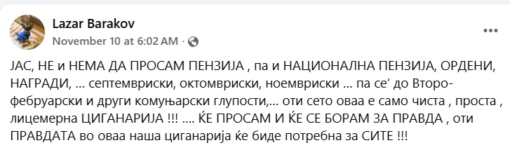 „ЈАС, НЕ и НЕМА ДА ПРОСАМ ПЕНЗИЈА , па и НАЦИОНАЛНА ПЕНЗИЈА, ОРДЕНИ, НАГРАДИ, … септемвриски, октомвриски, ноемвриски … оти сето оваа е само чиста , проста , лицемерна ЦИГАНАРИЈА !!! …. ЌЕ ПРОСАМ И ЌЕ СЕ БОРАМ ЗА ПРАВДА, оти ПРАВДАТА во оваа наша циганарија ќе биде потребна за СИТЕ“, е дел од статусот на Бараков.