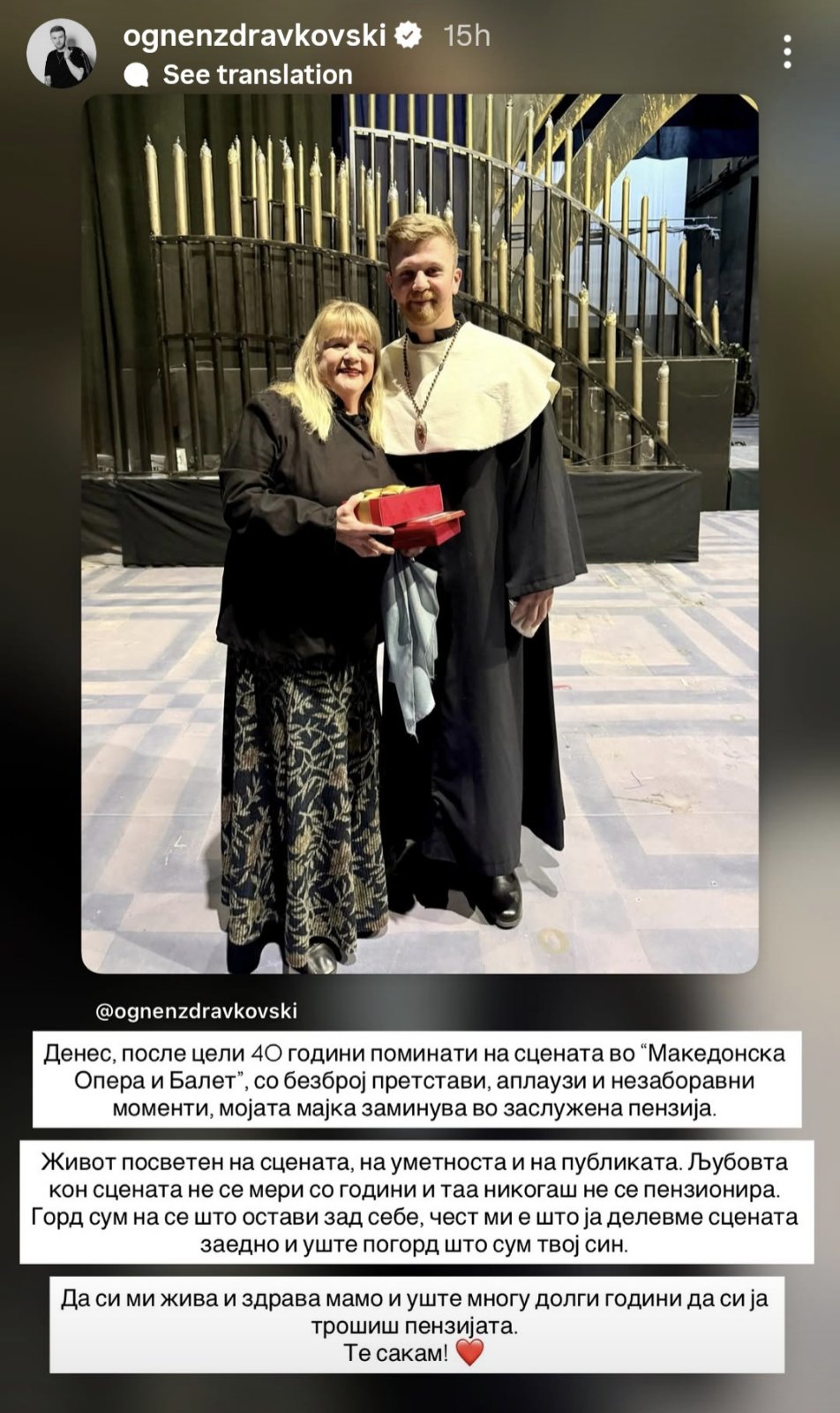 -После цели 40 години поминати на сцената во “Македонска Опера и Балет”, со безброј претстави, аплаузи и незаборавни моменти, мојата мајка заминува во заслужена пензија. Живот посветен на сцената, на уметноста и на публиката. Љубовта кон сцената не се мери со години и таа никогаш не се пензионира. Горд сум на се што остави зад себе, чест ми е што ја делевме сцената заедно и уште погорд што сум твој син. Да си ми жива и здрава мамо и уште многу долги години да си ја трошиш пензијата. Те сакам- напиша Огнен за мајка си.