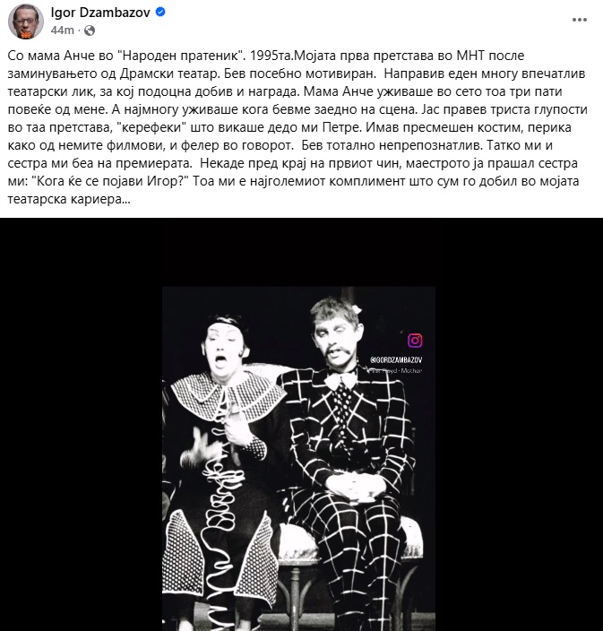 „Со мама Анче во “Народен пратеник”. 1995та.Мојата прва претстава во МНТ после заминувањето од Драмски театар. Бев посебно мотивиран. Направив еден многу впечатлив театарски лик, за кој подоцна добив и награда. Мама Анче уживаше во сето тоа три пати повеќе од мене.