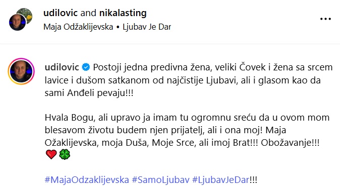 -Има една прекрасна жена, еден голем човек и една жена со срце на лавица и душа исткаена од најчистата Љубов, но и глас како самите Ангели да пеат!!! Слава му на Бога, имам огромна среќа да бидам нејзин пријател во овој мој будалест живот, но таа е моја! Маја Оџаклиевска, мојата душа, моето Срце, и мојот Брат!!! Обожавање!!!“, напиша Удиловиќ.