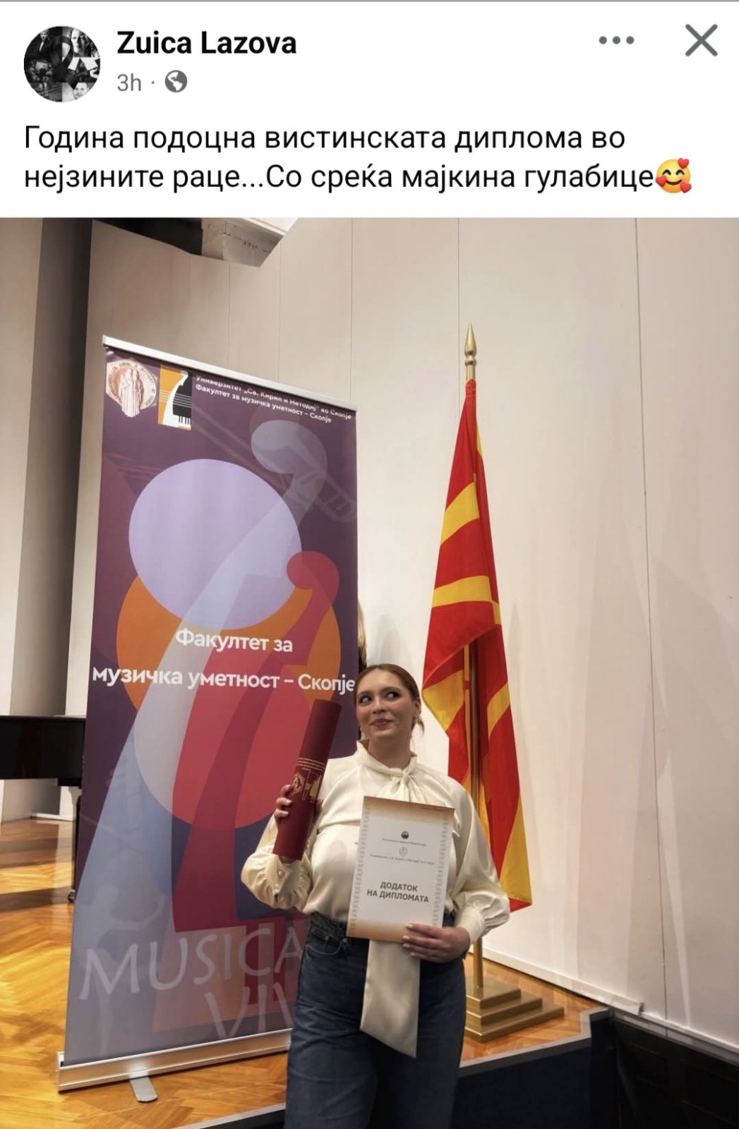 Имено, убавата Македонка дипломираше соло пеење на Факултетот за музичка уметност, а Зуица објави нејзина слика од моментот кога си ја зема диполомата и напиша: „Година подоцна вистинската диплома во нејзините раце. Со среќа мајкина гулабице“.