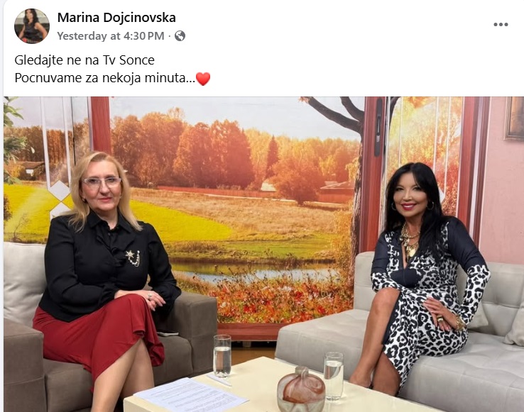 Тоа е телевизијата, според она што таа го објави на социјалните мрежи. Марина споделила фотографија од ТВ „Сонце“ од која порано беше дел и напиша: „Гледајте нè на ТВ ‘Сонце’, почнуваме за некоја минута“.