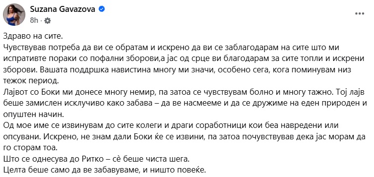 Сузана Гавазова да му се извини на сопругот Јасмин, вели еден коментар на нејзиниот Фејсбук профил, откако пејачката им се извини на своите фанови по вклучувањето во живо со шоуменот Боки 13 на неговиот ТикТок профил.