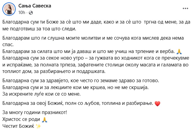 Благодарна за овој Божиќ, полн со љубов, топлина и разбирање. За многу години празникот!