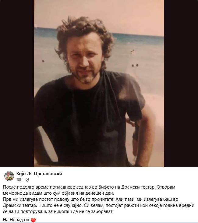 „После подолго време попладнево седнав во бифето на Драмски театар. Отворам меморис да видам што сум објавил на денешен ден. Прв ми излегува постот подолу што ќе го прочитате. Али пази, ми излегува баш во Драмски театар. Ништо не е случајно. Си велам, постојат работи кои секоја година вредни се да ги повторуваш, за никогаш да не се заборават.