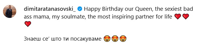 „Среќен роденден на нашата кралица, најсекси мама, мојата сродна душа, најинспиративната животна партнерка. Знаеш сè што ти посакуваме“, стои во честитката со неколку семејни фотографии.