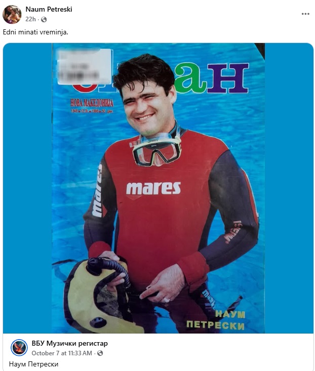 Пејачот кусо ја искоментирал оваа слика која ја реобјави Фејсбук страницата ВБУ Музички регистар. „Едни кинати времиња“, напишал Наум Петрески.