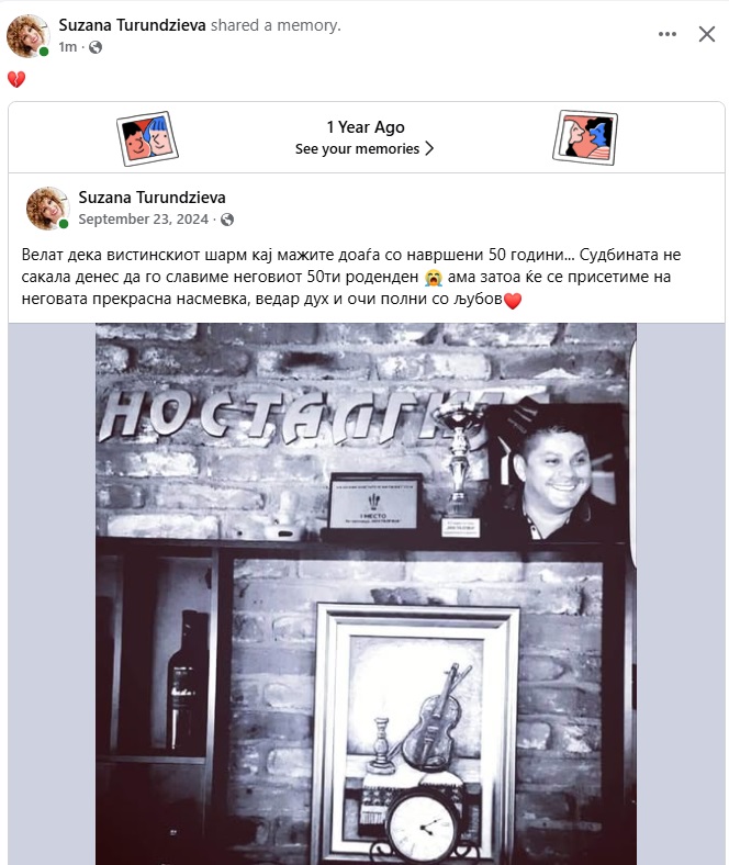 Со тажна објава, пејачката и водителка Сузана Турунџева се сети на својот покоен сопруг Марјан, кој ненадејно почина на 29 јули во 2016 година. Денес, познатиот скопски угостител требаше да го слави својот 51 роденден.