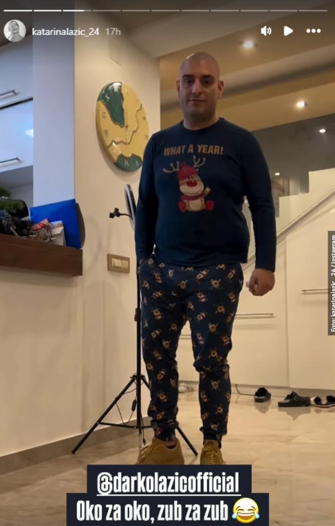 Таа објави видео на Инстаграм на кое Дарко Лазиќ, истрижан ќелав, во патики и пижами со ирваси, се спрема да оди во продавница, а во описот на видеото напиша:
