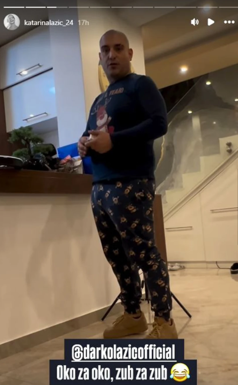 Таа објави видео на Инстаграм на кое Дарко Лазиќ, истрижан ќелав, во патики и пижами со ирваси, се спрема да оди во продавница, а во описот на видеото напиша: