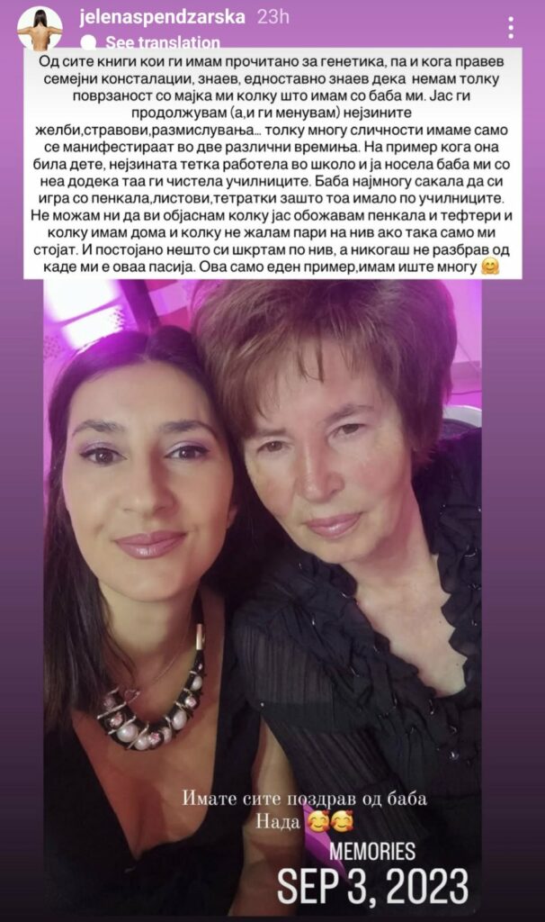 Јелена Спенџарска гените и убаината ги наследила од својата мајка, но и од својата баба. водителката и инфлуенсерка често споделува слики од своето семејство, особено последниве денови, кога е во родното Берово.