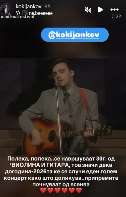 -Полека, полека, се навршуваат 30 години од „Виолина и гитара“, тоа значи дека договдина 2026 ќе се случи еден голем концерт како што доликува. Подготовките започнуват од есенва“, напиша Коки.