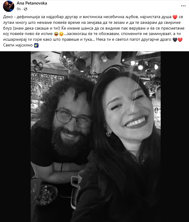-Деко – дефиниција за најдобар другар и вистинска несебична љубов, најчистата душа. Се лутам многу што немаме повеќе време на земјава да те зезам и да те замарам да свириме блуз (знам дека сакаше и ти!)