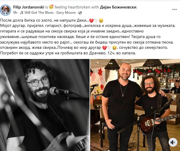 Твојата душа го заслужува најубавото место во рајот… секогаш ќе бидеш присутен во секоја отпеана песна, отсвирен акорд, жива свирка..Почивај во мир другар, сочувство до семејството. Погребот ќе се оддржи утре на гробиштата во Драчево, 12ч. во капела“, напиша Јордановски.