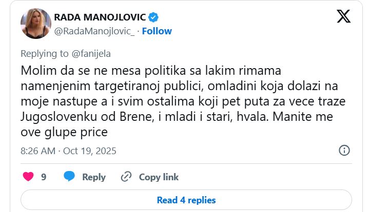 „Не ми мешајте политика со песната, аман! Кога нема никаква врска. Од сите профили на социјалните мрежи, само овде се фативте за политика и буквално ме малтретирате. Што ви кажува тоа? Дали е до вас? Песната е наменета за сите што се раселени низ светот и кои се родени во поранешна Југославија, само добро се римува и ве молам олабавете, навистина претерувате. Децата што излегуваат во клубовите и кои се моја публика исто така ја пеат од сесрце „Југословенка“, а тогаш не биле ни родени. Затоа, баталете со малтретирањето“, порача Рада и додаде: