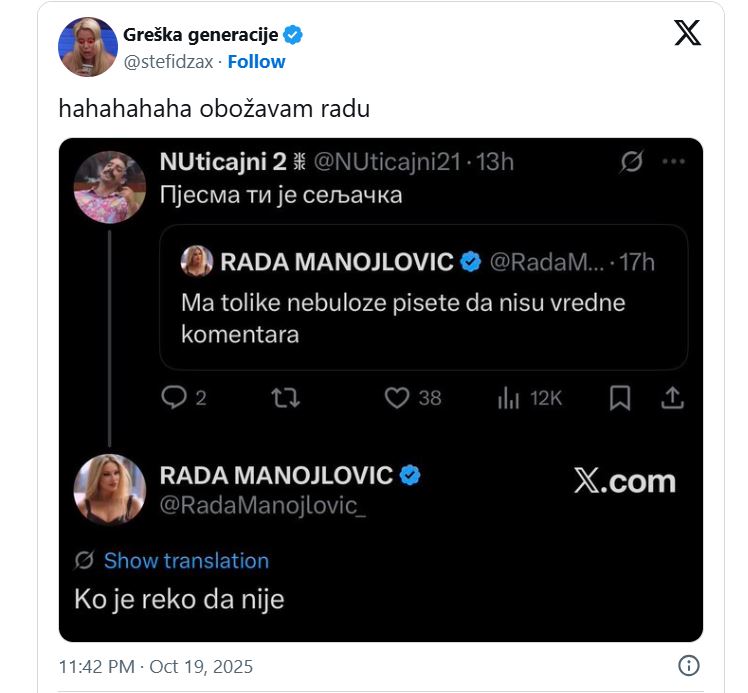 Иако новата песна на Рада Манојловиќ веќе има милиони прегледи, еден од нејзините стихови предизвика контроверзии на социјалната мрежа „X“ и ја изложи пејачката на навреди.