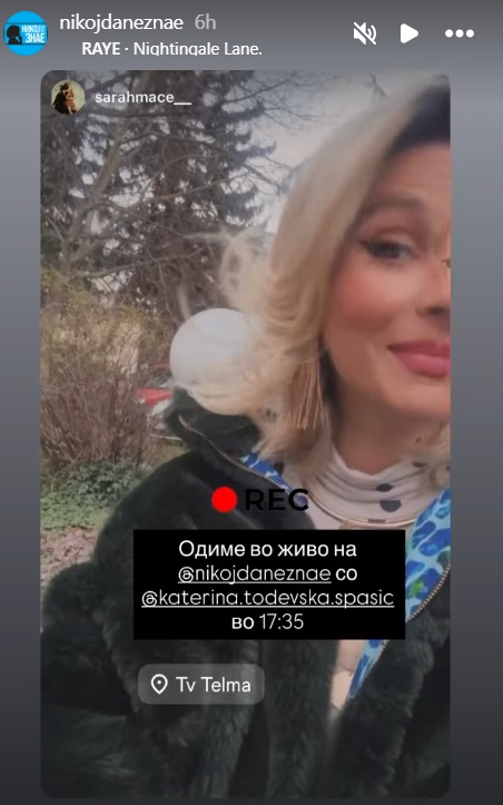 „Сите пријатели знаат дека планирам барам три-четири недели однапред. Инаку, нема како да ги остварам работите“, рече пејачката во емисијата „Никој да не знае“ на ТВ „Телма“, и додаде дека ако треба да се види со некој со месеци однапред планира.