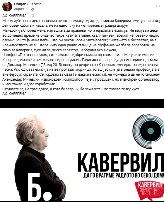 -АХ, КАВЕРВИЛ!!!!!!! Малку луѓе знаат дека направив нешто помалку од илјада емисии Кавервил, емитувани секој ден освен сабота и недела, не на едно туку на четиринаесет радија ширум Македонија.