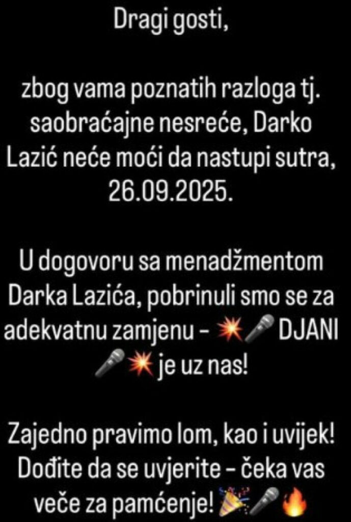 – Почитувани гости, од причини што ви се познати, односно сообраќајна несреќа, Дарко Лазиќ нема да може да настапи утре, 26 септември. – беше наведено, меѓу другото, во соопштението.