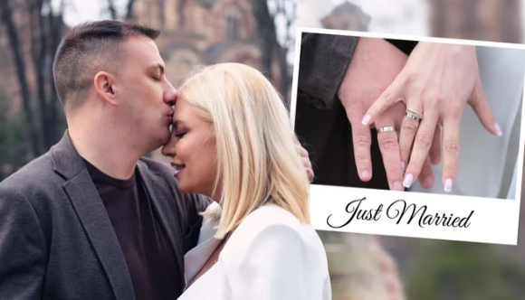 На фотографиите се забележуваат нивните специјално изработени венчални прстени од комбинација на бело и жолто злато, како и нивната среќа и љубов еден кон друг.
