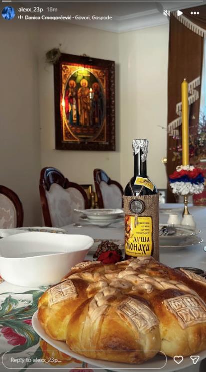 На објавата може да се види уредно поставена трпеза, славски колач, запалена свеќа и голема икона на ѕидот. Декорацијата е сведена, со нагласок на традицијата и духовниот аспект на празникот. Вино, празнични салфетки и внимателно подготвен прибор за јадење дополнително ја заокружуваат семејната атмосфера. Објавата беше проследена со духовната песна „Говори, Господе“.