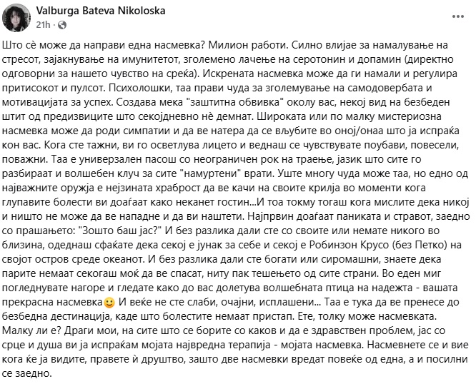 Драги мои, на сите што се борите со каков и да е здравствен проблем, јас со срце и душа ви ја испраќам мојата највредна терапија – мојата насмевка. Насмевнете се и вие кога ќе ја видите, правете ѝ друштво, зашто две насмевки вредат повеќе од една, а и посилни се заедно“, напиша Валбурга.
