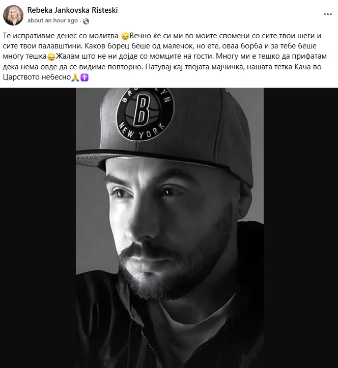 -Те испративме денес со молитва. Вечно ќе си ми во моите спомени со сите твои шеги и сите твои палавштини. Каков борец беше од малечок, но ете, оваа борба и за тебе беше многу тешка.