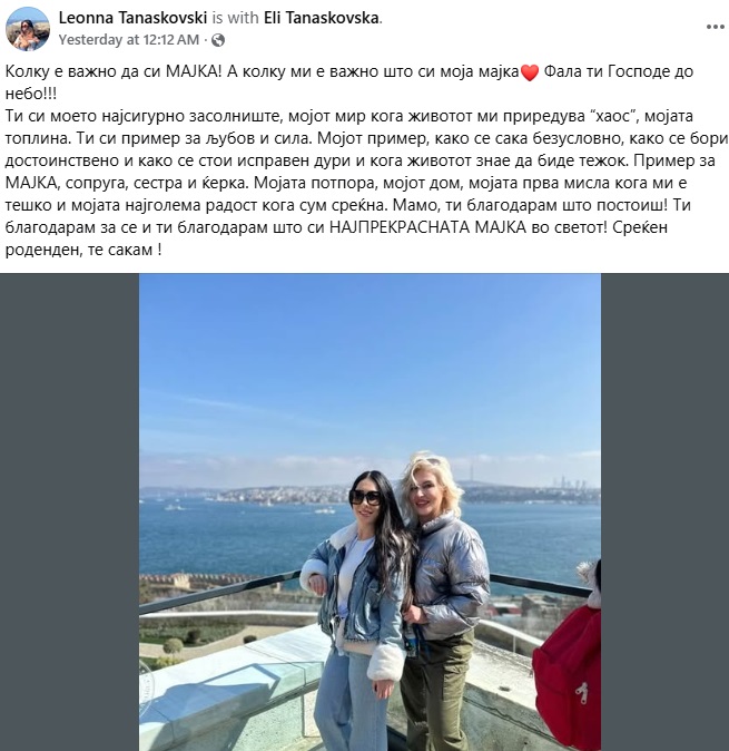 Мамо, ти благодарам што постоиш! Ти благодарам за се и ти благодарам што си НАЈПРЕКРАСНАТА МАЈКА во светот! Среќен роденден, те сакам“, напиша Леона за мајка си.