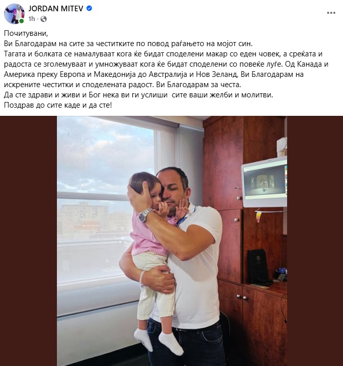 -Почитувани, Ви Благодарам на сите за честитките по повод раѓањето на мојот син. Тагата и болката се намалуваат кога ќе бидат споделени макар со еден човек, а среќата и радоста се зголемуваат и умножуваат кога ќе бидат споделени со повеќе луѓе.