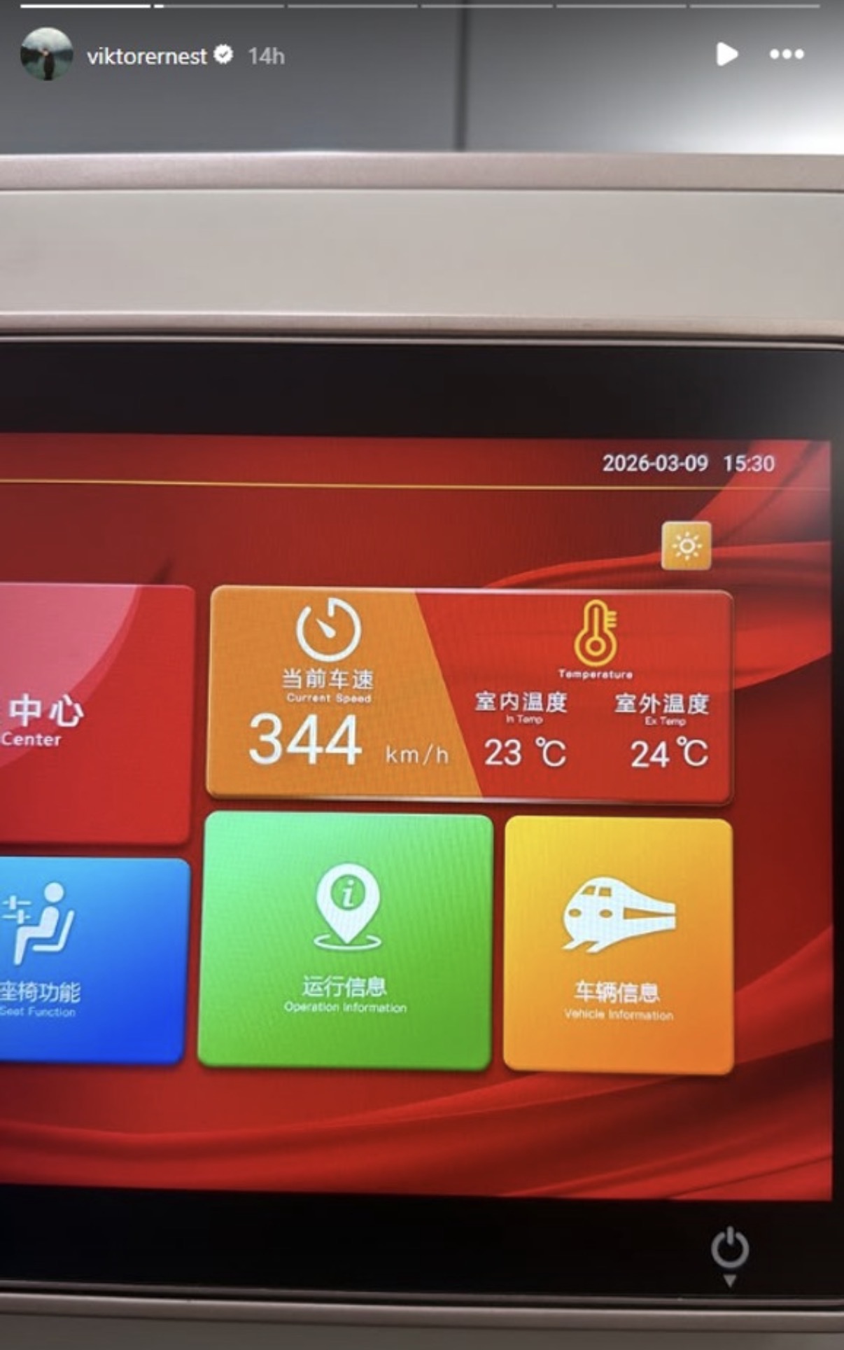 Виктор снимал како возот достигнува брзина од дури 344 километри на час, а на своите следбеници им ја покажал и внатрешноста на кабината, каде што имал сè што му е потребно за удобно патување.