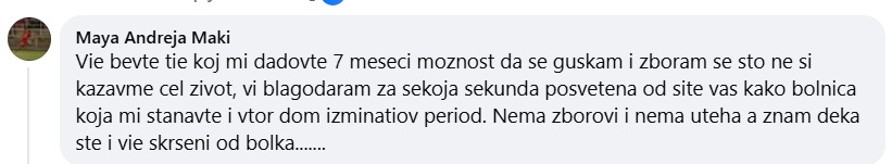 – Вие бевте тие кои ми дадовте 7 месеци можност да се гушкам и зборувам сѐ што не си кажавме цел живот, ви благодарам за секоја секунда посветена од сите вас како болница која ми станавте и втор дом изминатиов период. Нема зборови и нема утеха, а знам дека сте и вие скршени од болка“, коментираше Маја и доби многу одговори со сочувство и утеха. Од болницата, претходно напишаа: